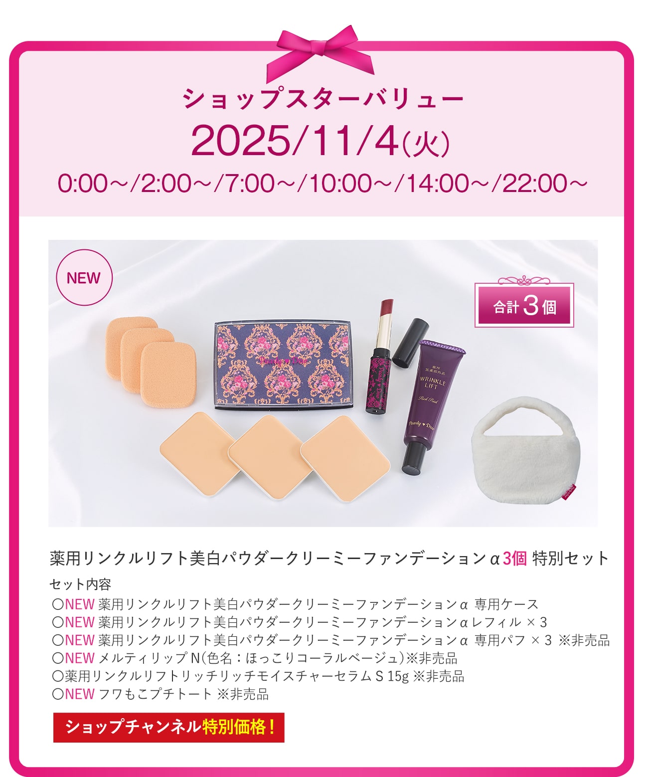 パーリーデュー 薬用リンクルリフト美白パウダークリーミーファンデーションα 3個特別セット/メーカー希望小売価格25,300円(税込) |