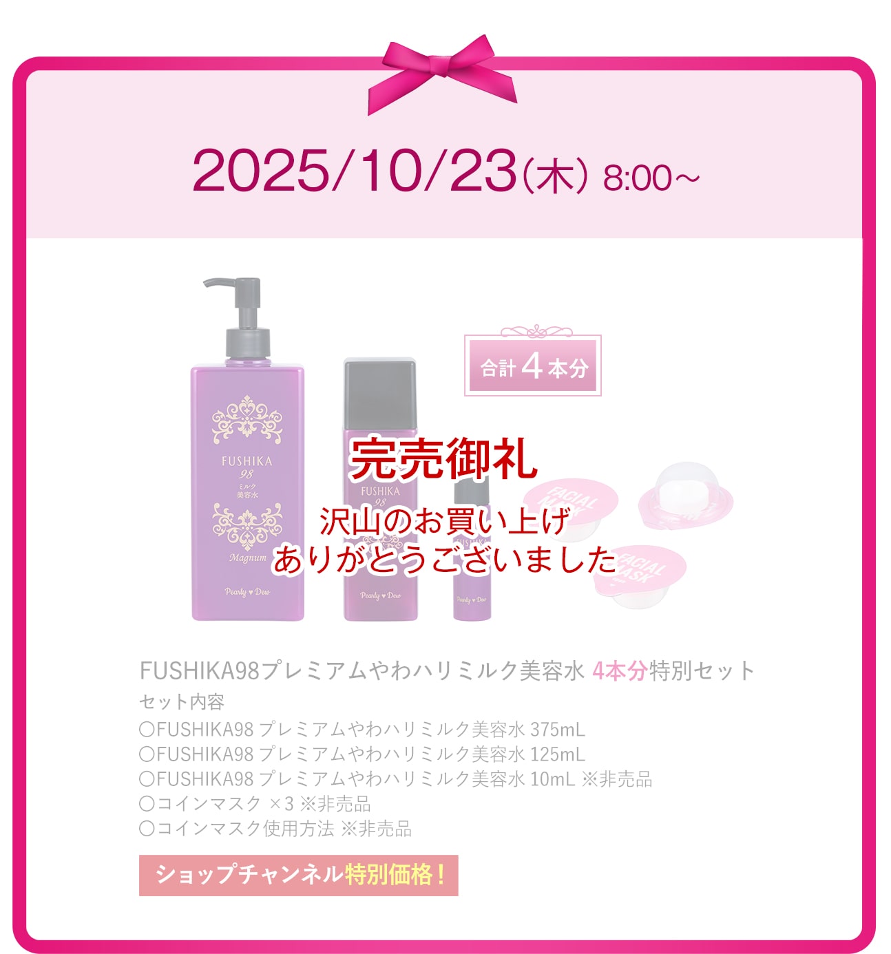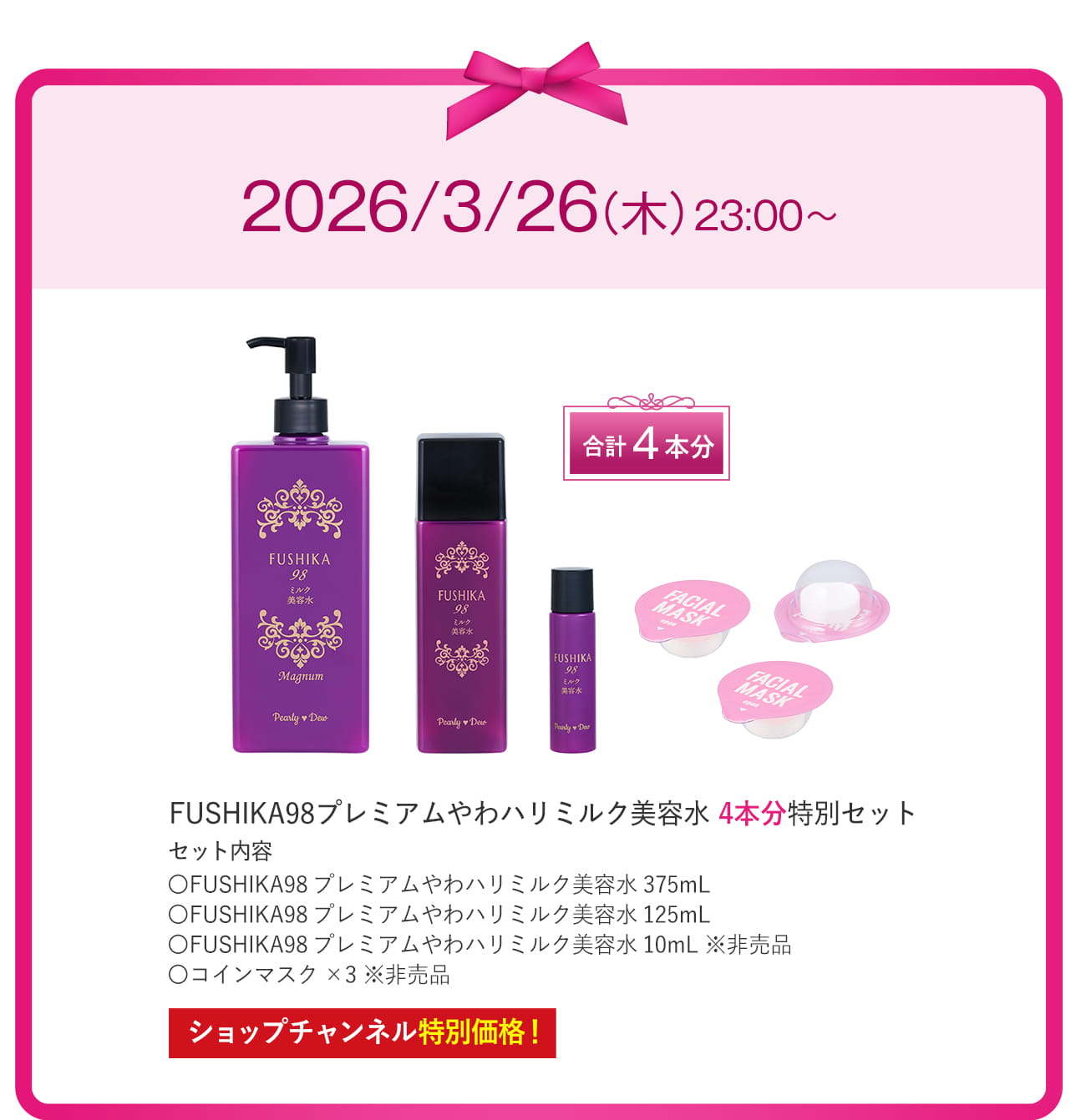 | パーリーデューFUSHIKA98プレミアムやわハリミルク美容水400mL/メーカー希望小売価格19,300円(税込) |
